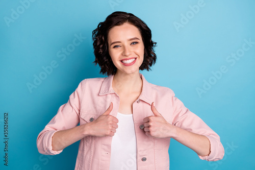 Photo of attractive cheerful lady short black hairdo raise thumb fingers up expressing positive attitude agreement wear casual pink denim jacket isolated blue color background