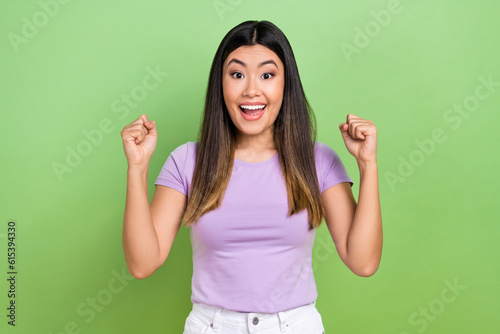 Photo of attractive korean girl fists hooray surprised shopaholic promo black friday best propositions isolated on green color background