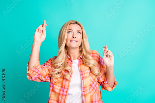 Photo of attractive mature woman look up empty space crossed fingers hope dressed stylish plaid clothes isolated on cyan color background