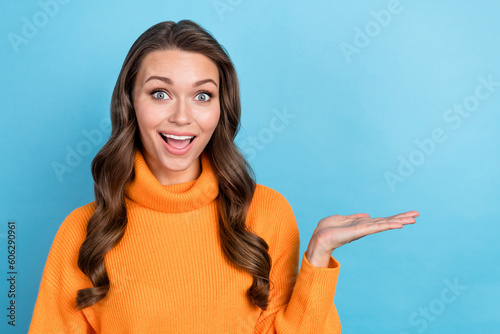 Photo of attractive overjoyed lady showing novelty product hold open palm wear pullover isolated blue color background