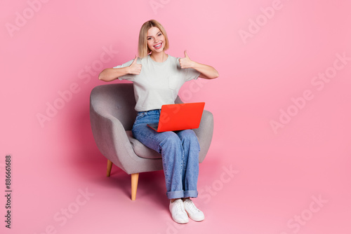 Photo of attractive pretty cute girl wear trendy grey clothes nice work thumb up isolated on pink color background