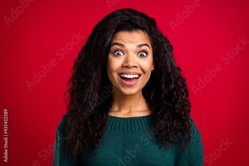 Photo of attractive shocked nice dark skin young woman amazed sale news isolated on red color background