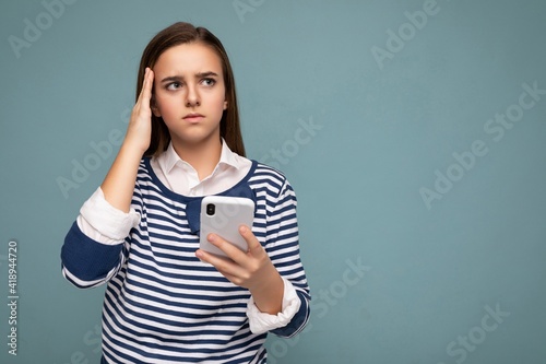 Photo of attractive young girl wearing striped longsleev standing isolated over blue background surfing on the internet via phone looking to the side and thinking