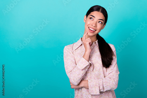 Photo of attractive young japanese girl boss ceo think start up strategy wear stylish smart casual outfit isolated on cyan color background