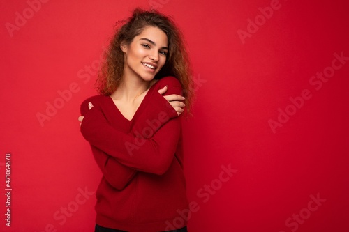 Photo of beautiful attractive charming positive happy smiling young brunette curly woman wearing stylish dark red sweater isolated over red background wall with free space for text