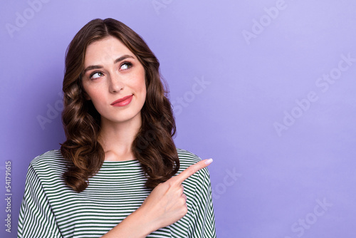 Photo of beautiful pretty woman pouted lips dreamy looking finger direct empty space proposition solve problem isolated on violet color background