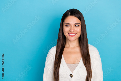 Photo of brunette cute mature lady look empty space wear white pullover isolated on blue color background