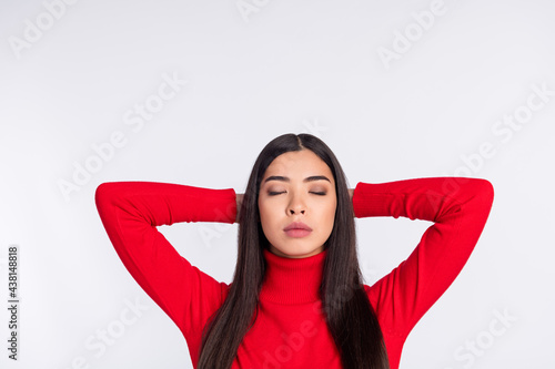 Photo of calm cheerful brown long hairdo adult hands head wear red sweater isolated on grey color background