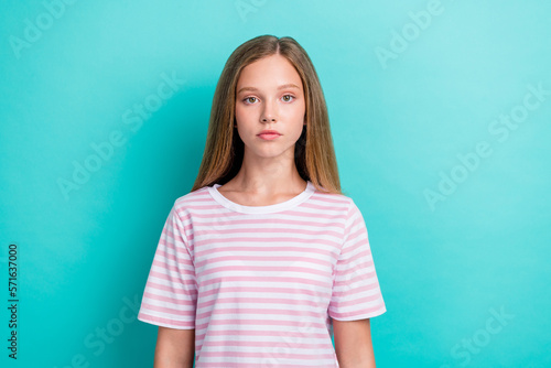 Photo of calm serious young girl look camera wear striped t-shirt isolated on aquamarine color background