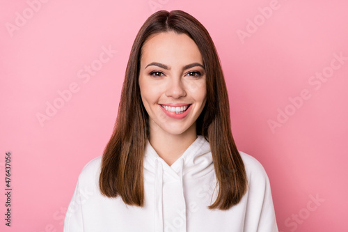 Photo of charming adorable young woman dressed white sweatshirt smiling isolated pink color background