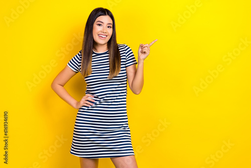 Photo of charming asian beauty girl showing way to adv ads banner poster wear trendy short sarafan isolated yellow background