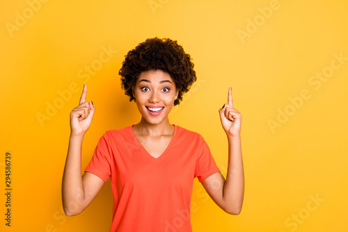 Photo of charming cheerful attractive girlfriend afro american pointing up to show you something while wearing t-shirt isolated over yellow vibrant color background