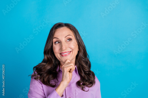 Photo of charming dreamy woman wear violet shirt arm chin looking empty space isolated blue color background
