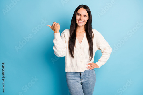 Photo of charming girl put hand on waist indicate thumb empty space promotion isolated on blue color background