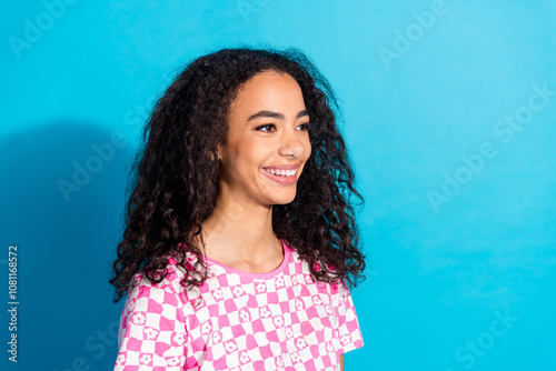 Photo of charming positive girl wear print t-shirt smiling looking empty space isolated blue color background