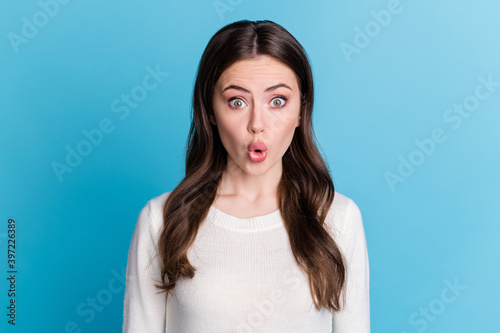 Photo of charming shocked curly woman dressed white pullover big eyes isolated blue color background