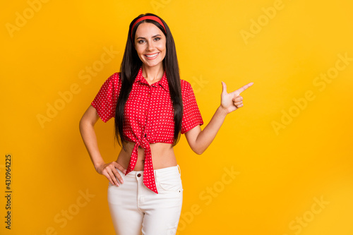 Photo of charming sweet young lady wear red shirt arm waist pointing empty space isolated yellow color background