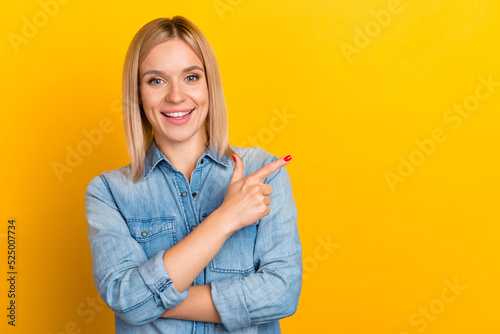 Photo of charming young woman dressed shirt smiling pointing finger empty space isolated yellow color background