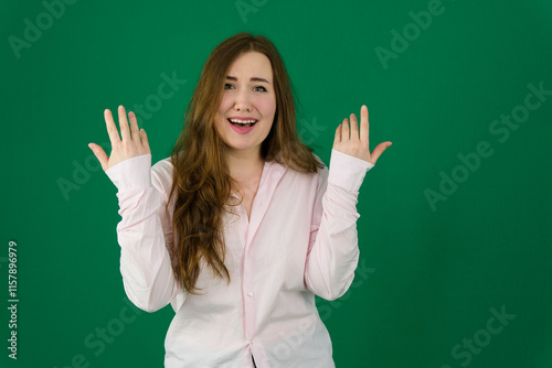 Photo of cheerful beautiful young woman standing isolated over white wall background. Looking camera showing winner gesture. High quality photo