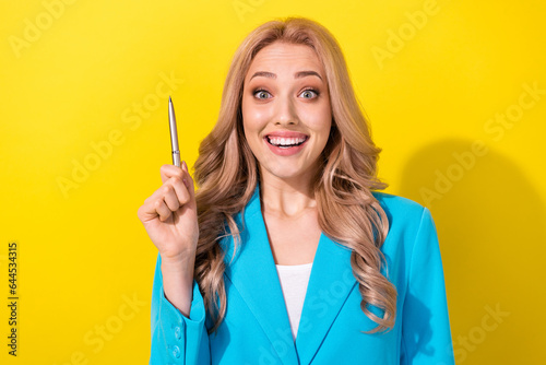 Photo of cheerful clever lady hand hold point pen toothy smile bright idea isolated on yellow color background