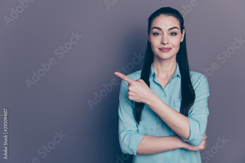 Photo of cheerful cute charming nice lecturer holding training teaching you pointing at empty space isolated over grey color background