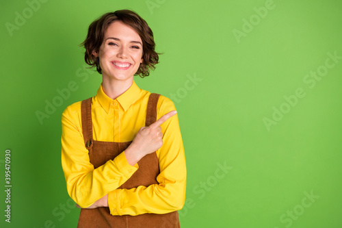 Photo of cheerful girl toothy smile direct finger empty space wear yellow shirt overall isolated green color background