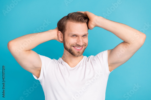 Photo of cheerful guy arms on head touch hair beaming smile look camera isolated on blue color background