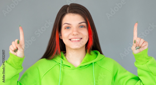 Photo of cheerful happy woman dressed in green hoodie pointing up over grey background. Look at camera.