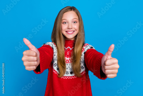 Photo of cheerful lovely lady demonstrate two hands thumbs up enjoying cool party weekend event isolated on blue color background