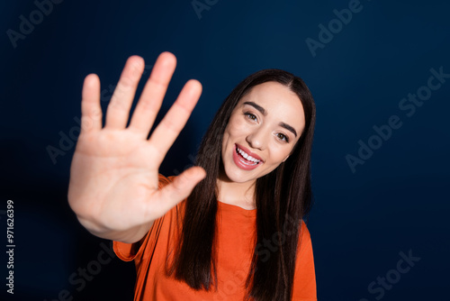 Photo of cheerful positive carefree cute woman wear orange trendy clothes hand palm hi sign isolated on dark blue color background