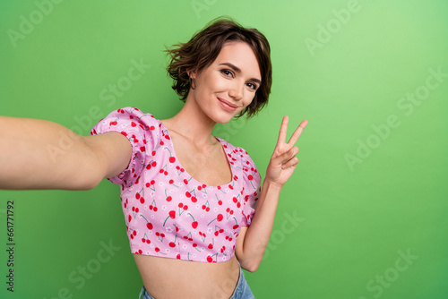 Photo of cheerful positive lovely woman dressed pink blouse making selfie recording video show v-sign isolated on green color background