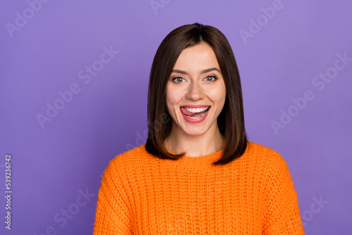 Photo of cheerful positive person beaming smile tongue lick teeth isolated on violet color background