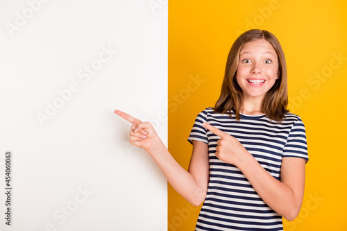 Photo of cheerful pupil beaming smile direct fingers empty space proposition isolated on yellow color background