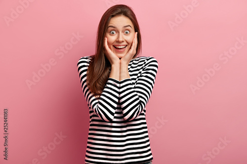 Photo of cheerful surprised woman touches cheeks, has eyes full of amazement and happiness, doesnt expect to recieve bonus or win lottery, wears striped sweatshirt, models indoor. Human feelings