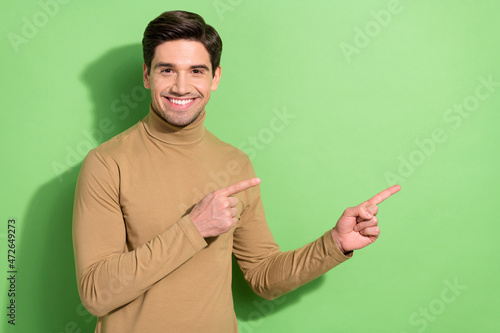 Photo of cheerful young man indicate two fingers empty space proposition isolated on green color background