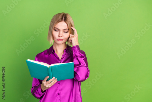 Photo of clever gorgeous girl wear stylish pink satin clothes hold read book isolated on green color background