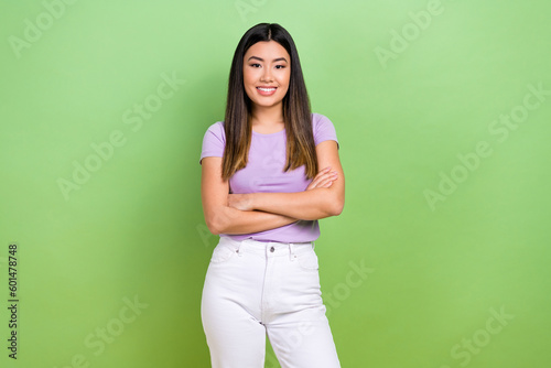 Photo of confident chinese business lady wear purple t-shirt crossed hands satisfied project manager isolated on green color background