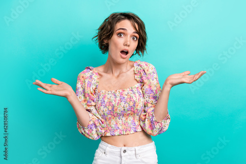 Photo of confused astonished woman with short hairstyle wear colorful top shrug shoulder staring isolated on turquoise color background