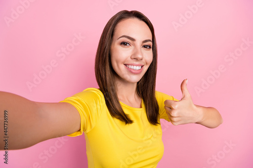 Photo of cool brunette hair millennial lady do selfie show thumb up wear yellow t-shirt isolated on pink color background