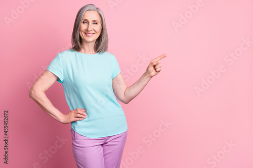 Photo of cool elder grey hairdo lady point empty space wear teal blouse isolated on pink color background