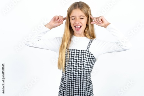 Photo of crazy Beautiful caucasian teen girl screaming and pointing with fingers at hair closed eyes