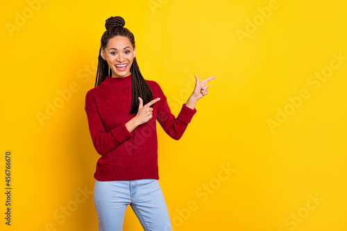 Photo of cute adorable dark skin woman dressed red sweater pointing empty space smiling isolated yellow color background