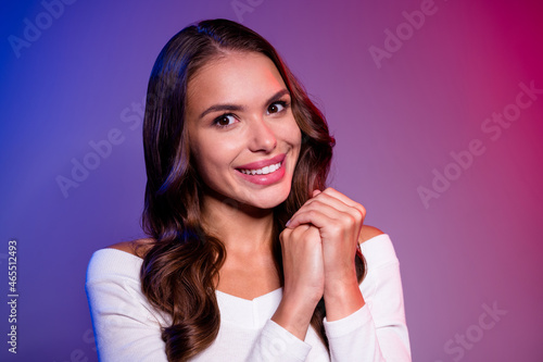 Photo of cute dreamy young woman wear white shirt empty space arms hands together smiling isolated gradient blue red color background