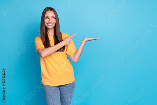 Photo of cute girlish lovely woman straight hairdo yellow t-shirt demonstrating promo look empty space isolated on blue color background