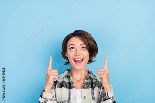 Photo of cute impressed young lady wear plaid shirt pointing fingers up looking empty space isolated blue color background