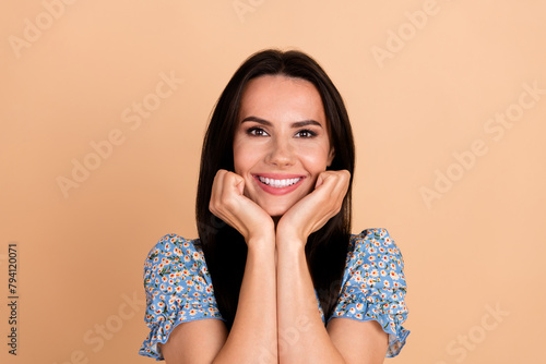 Photo of cute lovely adorable kind woman wear blue stylish print clothes isolated on beige color background