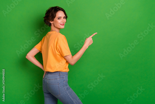 Photo of cute positive young lady wear orange outfit smiling pointing empty space isolated green color background