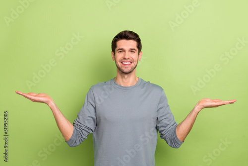 Photo of cute young brunet guy hold empty space wear grey shirt isolated on green color background