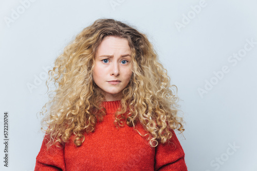 Photo of displeased unhappy young woman with curly bushy blonde hair, frowns face in bewilderment, wears casual clothing, models against white studio background. People and disappointment concept
