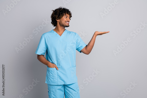 Photo of doc guy hold hand look demonstrate empty space isolated grey color background